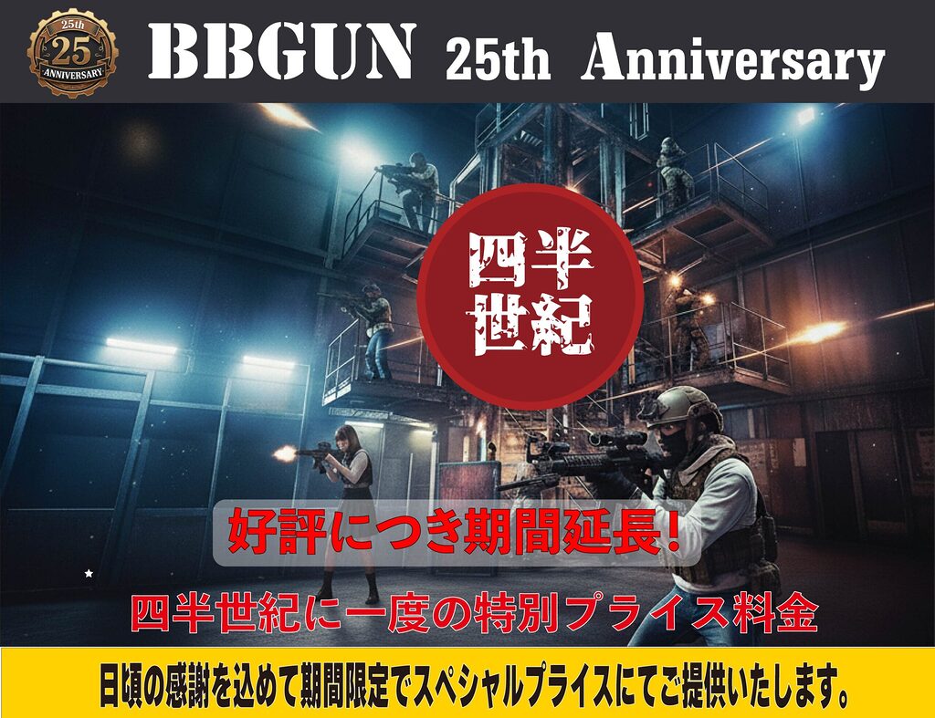 四半世紀の進化、新レイアウト始動! おかげさまでBBGUNは25周年。 その節目にふさわしい、新たな戦術空間が完成しました。 これまでの経験、挑戦、改良を積み重ねた集大成。 “戦うフィールド”が、次の次元へ。 この進化を