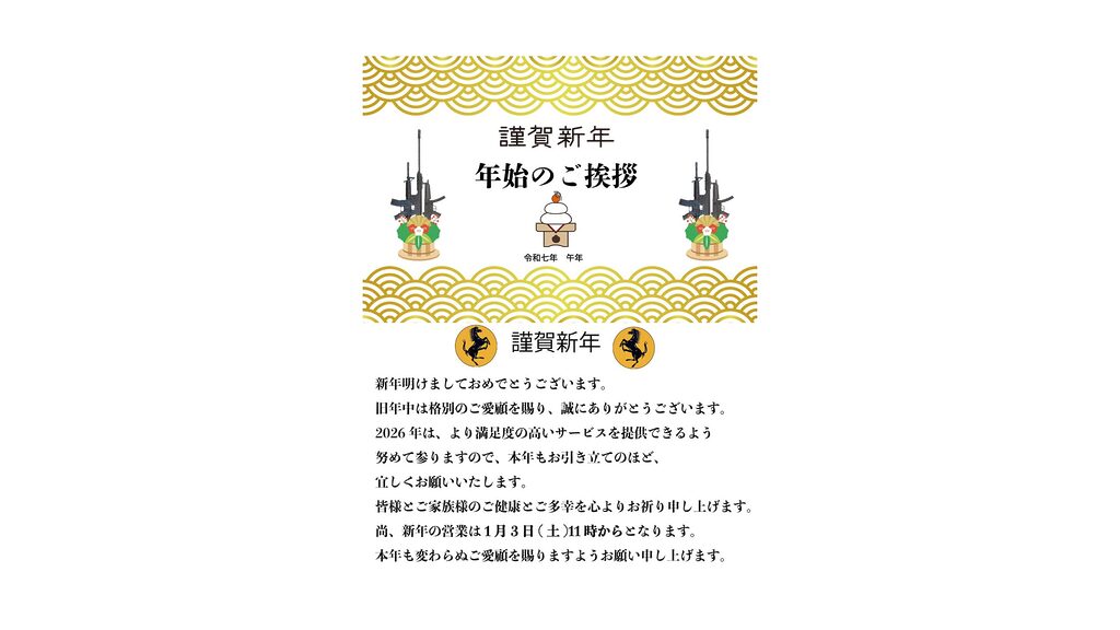 年末年始の営業日時のご案内 今年もBBGUNをご利用いただき、誠にありがとうございます。 おかげさまでBBGUNは『四半世紀(25周年)』を迎えることができました。 長年支えてくださった皆さまへ、心より感謝申し上げます。